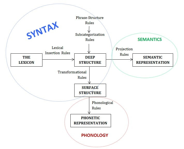 Chomsky’s next book, Aspects of the Theory of Syntax (1965), systematized and extended the framework sketched in Syntactic Structures by proposing a fully articulated theoretical architecture for linguistic competence, later known as Standard Theory. As we mentioned earlier, he abstracts away any actual speakers as “performance” and instead focuses on the competence of an “ideal speaker-listener.” In fact, the actual question he attempted to answer was, how a child could learn a language despite having listened to “imperfect speakers” or actual people. He states: