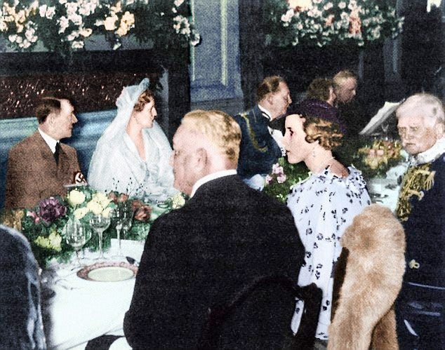 In 1935, the queen's sister-in-law is pictured with Hitler at Hermann Göring's wedding.