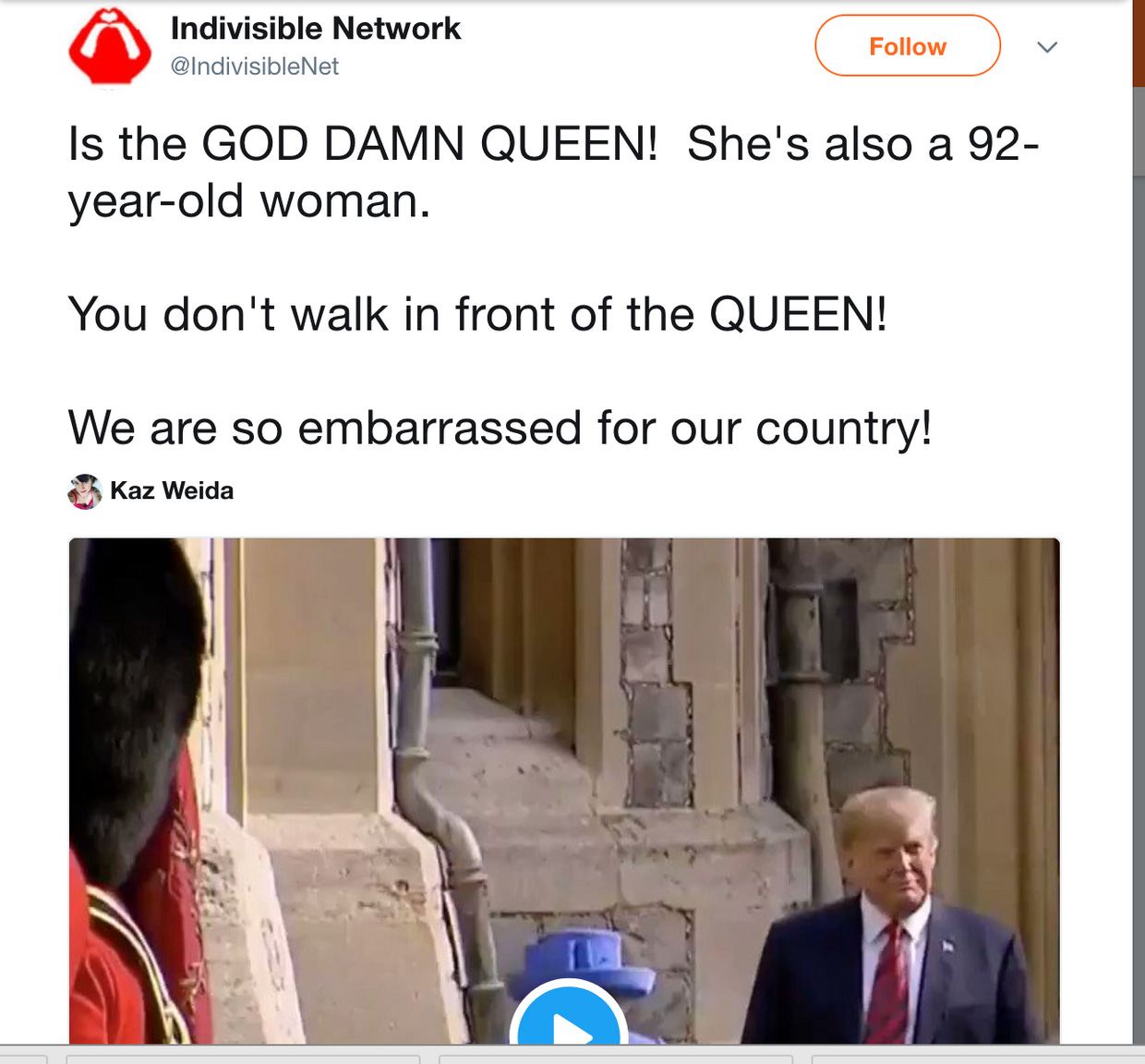 Last week, when Trump accidentally walked past the Queen. Disrespecting the Queen was one of the few decent actions by the President. Nonetheless, we have every liberal clutching their pearls about the royal protocol and making apologies on behalf of the whole country for disrespecting the queen.