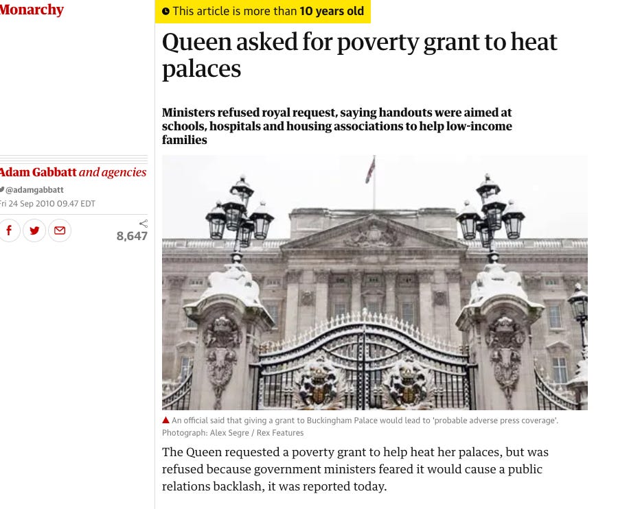 While the Tories continue to cut benefits from the poor, the Queen had the audacity to ask for a poverty grant to heat Buckingham Palace.