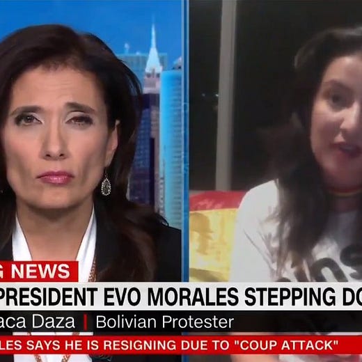 Mainstream media has been obediently disposing talking points from the nat-sec state. Despite the fact that President Evo Morales won by a 10 point margin, they keep peddling the myth that he “barely scrapped by” and that there was election irregularities. CNN has had completely partisan right-wingers posing as “Bolivian activists” on such as Jhanisse Vaca Daza